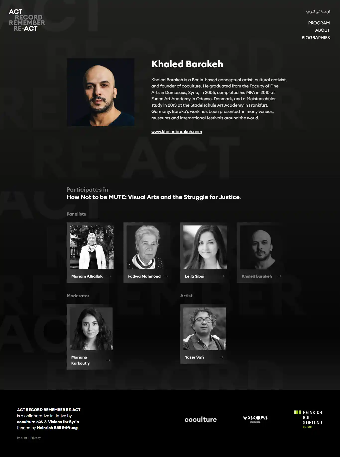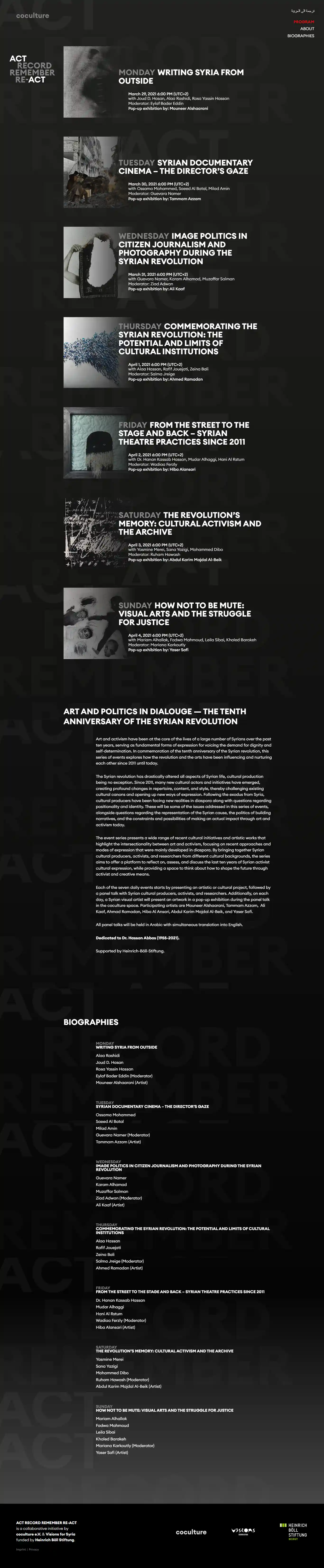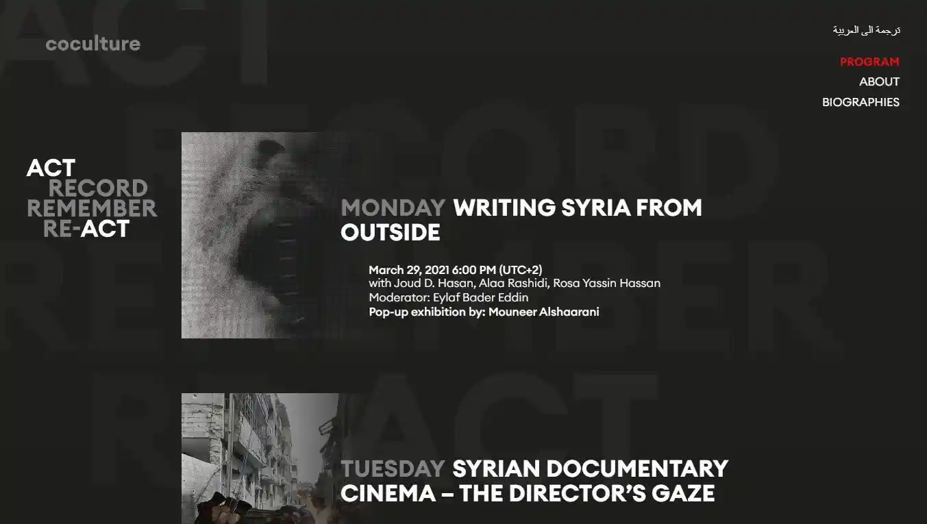 Act, Record, Remember, Re-Act des coculture e.V. ist eine Serie von Bühnendiskussionen anlässlich des zehnjährigen Jubiläums der Arabischen Revolution.